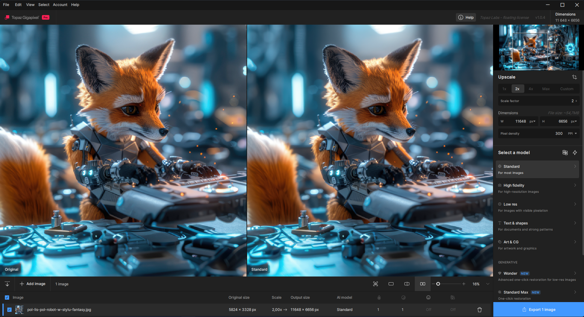 Topaz Gigapixel to wiodący w branży, oparty na sztucznej inteligencji (AI) program do skalowania obrazów, który maksymalizuje zarówno poziom szczegółowości, jak i dokładność oryginału. Nie chodzi tylko o tworzenie nowych pikseli, ale o tworzenie odpowiednich. Dzięki temu Twoje obrazy będą większe i ostrzejsze, bez utraty początkowej szczegółowości.