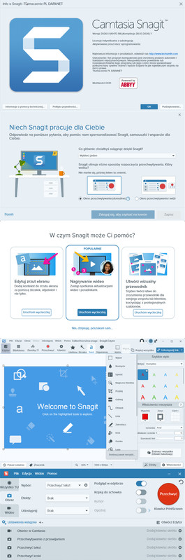 SnagIt, wielokrotnie nagradzane oprogramowanie do przechwytywania ekranu . Używając SnagIt, możesz wybrać i przechwycić cokolwiek na ekranie, a następnie łatwo dodać tekst, strzałki lub efekty i zapisać przechwyt do pliku lub udostępnić go natychmiast za pomocą poczty e-mail lub komunikatora. Przechwyć i udostępnij artykuł, obraz lub stronę internetową bezpośrednio z ekranu. Lub przechwyć i udostępnij dowolną część dowolnej aplikacji uruchomionej na komputerze. Automatycznie zapisuj w jednym z 23 formatów pliku lub wysyłaj do drukarki, na pocztę e-mail lub do schowka.